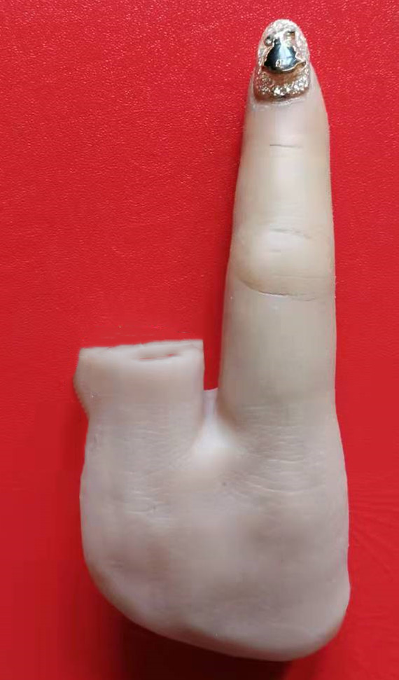 目前,對(duì)于手指截肢的患者來說,可供選擇的假肢種類非常少。大多數(shù)手指截肢的患者只能選擇美容手指,這種手指外面是硅膠手皮,里面填充的是發(fā)泡劑。這種美容手指可以被動(dòng)彎折,主要是起到美觀的作用,實(shí)用功能不強(qiáng)。