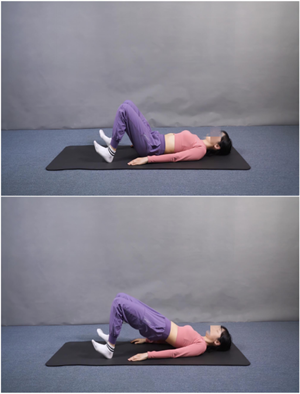 ① 步驟:仰臥位,雙手放在兩邊,屈膝,隨后臀部抬起,身體保持一條直線,停留3-5個呼吸還原姿勢。