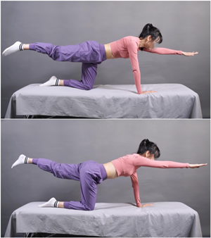 ① 步驟:四點支撐跪在瑜伽墊上,舉起左手,右腿向后抬起,手臂不用高于肩膀,避免聳肩,腿不要高于髖部。過程盡量維持穩(wěn)定,減少身體晃動。